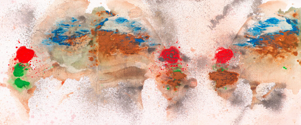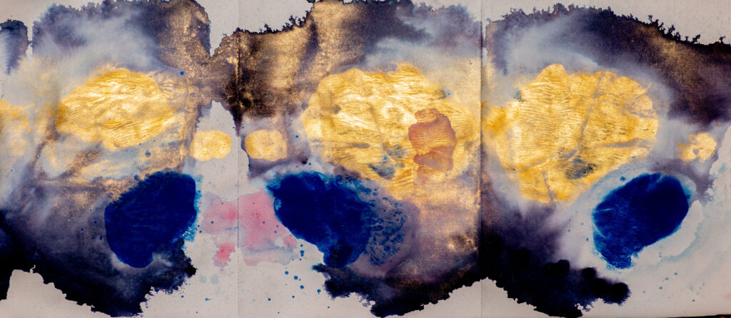 “I found myself using paint as a method to depict conversation and discussion. By placing different lines and wet paint shapes on one side or the other of a page divided into three parts, and folding each side into an empty center space, the effect not only amplified the paint on each side but also created equal yet distinct points of view in each of the three panels. Some colors and forms were identical, some were overpowered, and some remained untouched. I call these works “Three Sides of the Truth”: there is your side, their side, and in the middle is the truth. The works abstractly depict the nuances of debate.”.